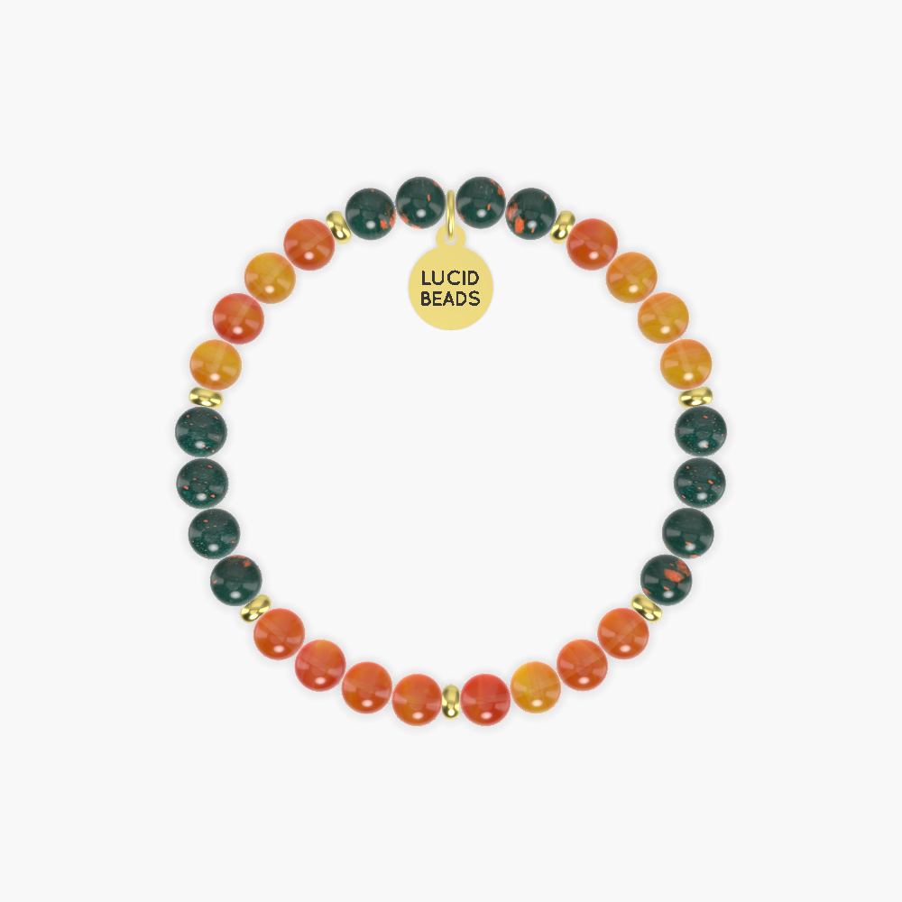 This is a bracelet crafted with vibrant Carnelian and soothing Moss Agate beads, accentuated by elegant gold stainless steel spacers. Carnelian, with its fiery orange hues, symbolizes motivation, courage, and vitality, while Moss Agate, with its lush green tones, represents growth, abundance, and harmony. These gemstones complement each other beautifully, creating a harmonious balance of energy. The gold stainless steel spacers add a touch of sophistication and enhance the overall aesthetic. This bracelet is a perfect blend of vibrant energy and calming serenity, making it a meaningful and stylish accessory.