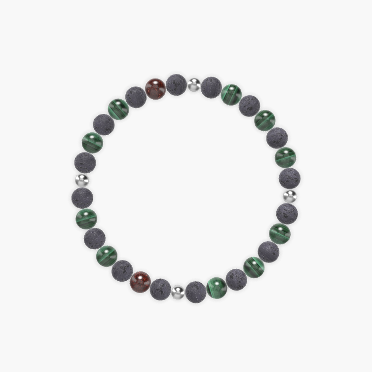 This bracelet is a stunning combination of Lava Rock and Dalmatian Jasper beads. The Lava Rock beads, with their deep black color, symbolize strength and grounding. They are believed to provide stability and courage during times of change. The Dalmatian Jasper beads, with their unique spotted pattern, represent joy and playfulness. They are said to bring a sense of fun and positivity to the wearer. The contrasting colors of black and white create a striking visual appeal, making this bracelet a perfect balance of strength and joy.